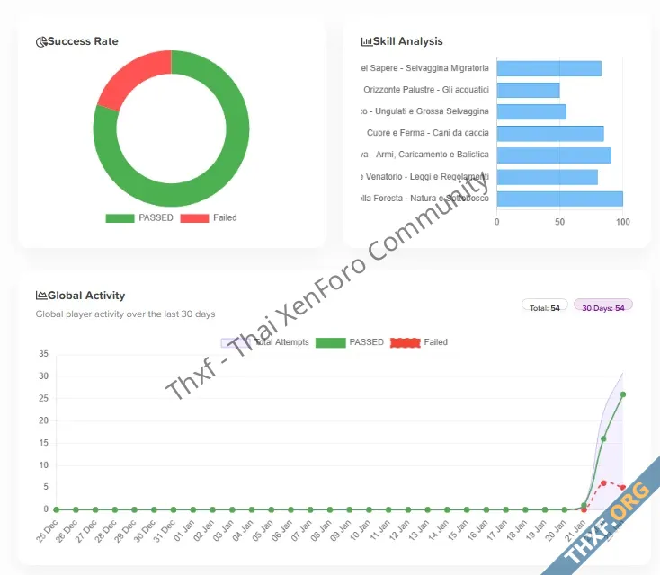- Horizontal Skill Analysis: Visualize user strengths by category. Success Rate: Donut charts for Pass/Fail ratios. Activity Trends: 30-day activity graph.