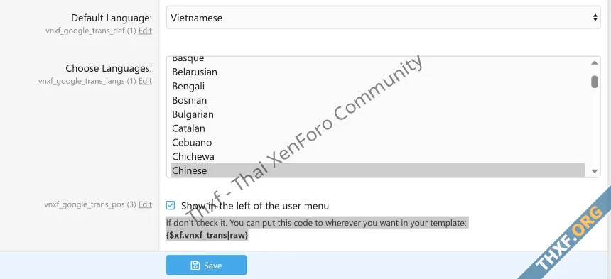 - Extract and upload the files to the folder: src/addons/VNXF/GoogleTrans/.