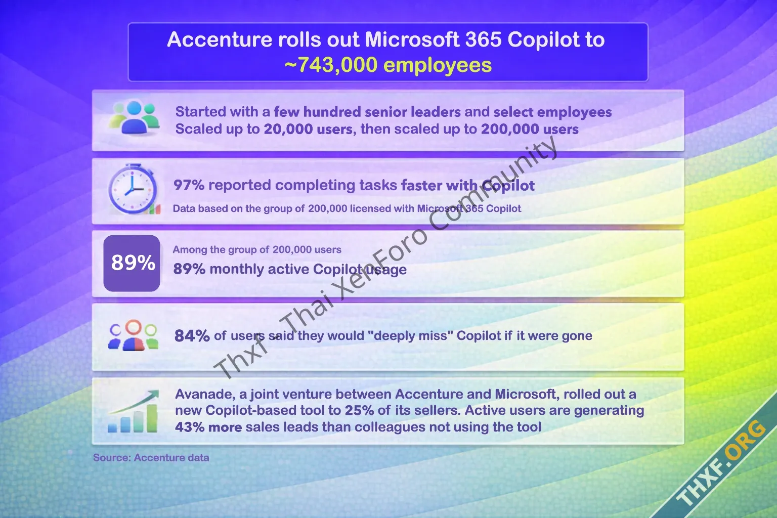 ไมโครซอฟท์ประกาศความสำเร็จว่าบริษัทที่ปรึกษารายใหญ่ของโลก Accenture สั่งซื้อผลิตภัณฑ์เรือธงแห่งยุคสมัย Microsoft 365 Copilot ให้กับพนักงาน 743,000 คนทั่วโลก (พนักงานทั้งหมดมี 780,000 คน) ถือเป็นการใช้งาน Copilot ระดับองค์กรที่ใหญ่ที่สุดเท่าที่ไมโครซอฟท์เคยขายมา