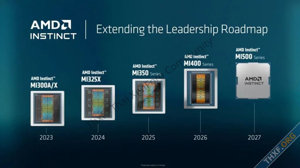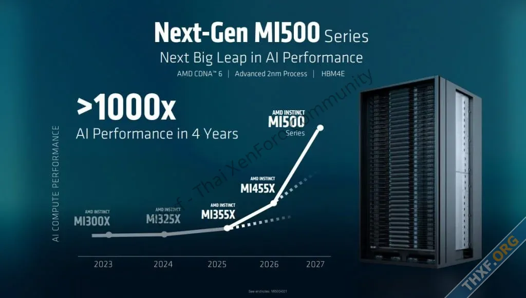 Lisa Su ซีอีโอ AMD ยังเปิดเผยรายละเอียดเพิ่มเติมของจีพียูใหม่ตระกูล MI500 ที่มีกำหนดออกมาในปีหน้า 2027 เป็นครั้งแรก ใช้สถาปัตยกรรม CDNA 6, ผลิตบนเทคโนโลยี 2 นาโนเมตรขั้นสูง, หน่วยความจำ HBM4E และมีประสิทธิภาพสำหรับงาน AI ดีกว่า MI300X ที่ออกมาปี 2023 มากกว่า 1 พันเท่า