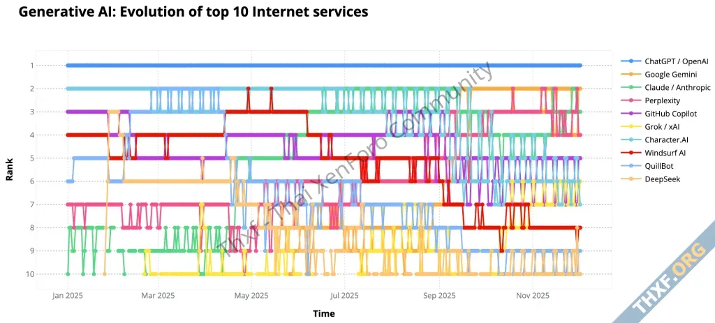 อย่างไรก็ตามทราฟิกที่เพิ่มขึ้นมากนี้ ก็มีปัจจัยหลักคือบรรดาบอต AI เฉพาะ Googlebot คนเดียวมีส่วนแบ่งมากถึง 4.5% ส่วนการค้นหาจาก AI ที่มีผู้ใช้งานส่งคำสั่งอีกที มีปริมาณเพิ่มขึ้นถึง 15 เท่าจากปีก่อน ขณะที่บริการ Generative AI นั้น ChatGPT ของ OpenAI ครองทราฟิกตลอดทั้งปีเป็นอันดับ 1 ส่วน Google Gemini อยู่ในอันดับ 4 แต่ถ้าดูเฉพาะสถิตินับตั้งแต่เดือนกันยายน Gemini ก็แรงจนขึ้นมาเป็นอันดับ 2 ต่อเนื่องยาว ๆ แล้ว