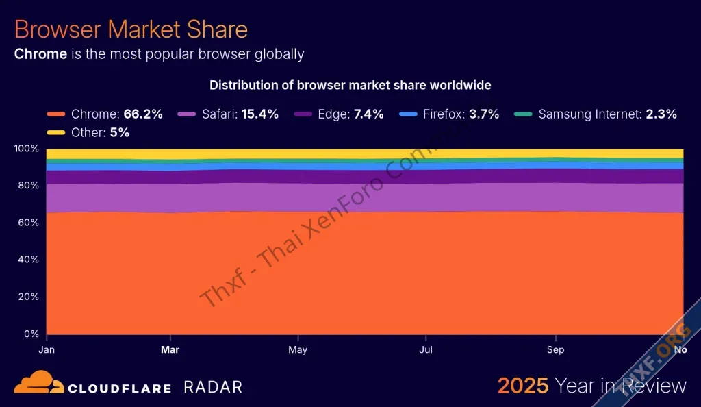 - Chrome มีส่วนแบ่งเบราว์เซอร์อันดับ 1 ที่ 66.2% อันดับ 2 คือ Safari 15.4%