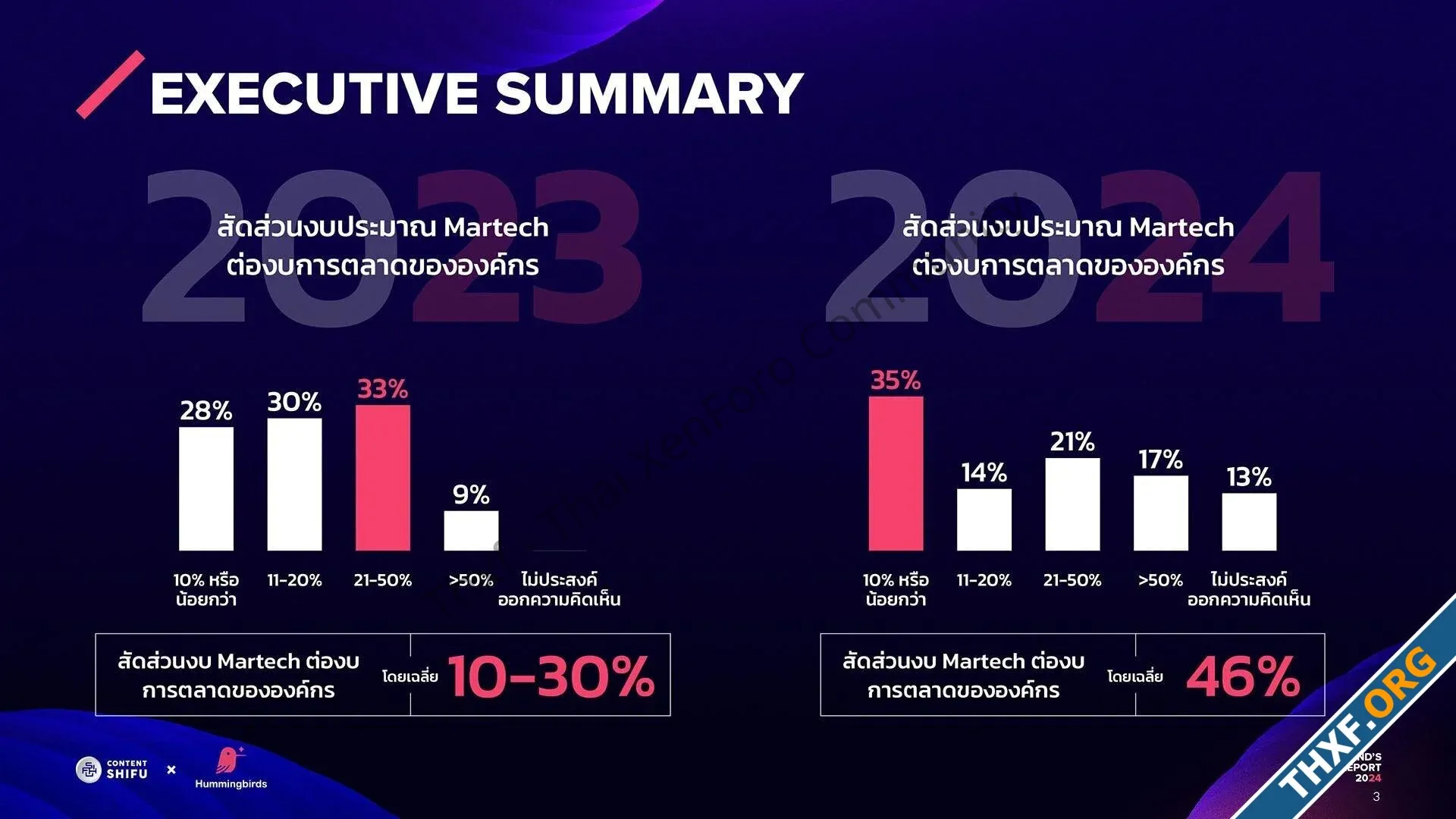 นอกจากนี้งบที่องค์กรจะลงทุนกับ Martech นั้นมีแนวโน้มเพิ่มขึ้นถึงเฉลี่ย 46% ต่องบการตลาดองค์กร เมื่อเทียบกับปี 2023 ที่ลงทุนเฉลี่ยที่ 10-30%