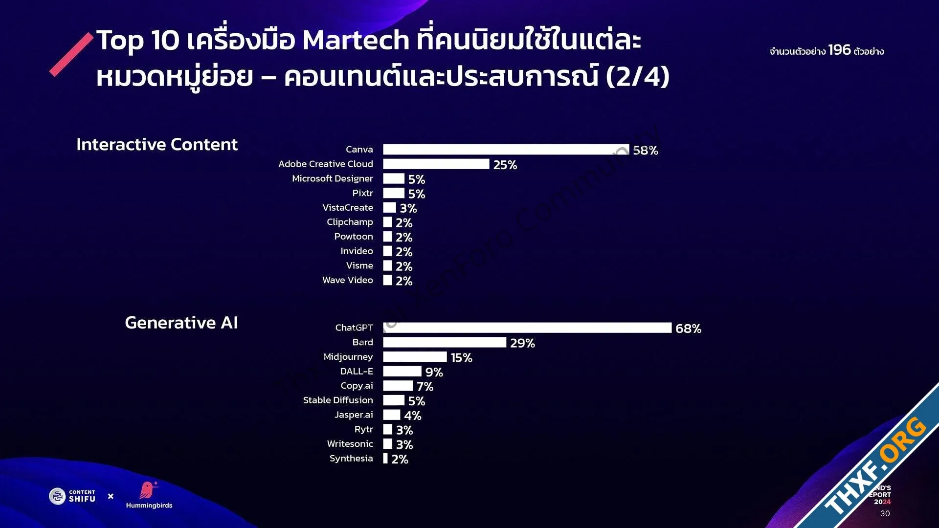 ปิดท้ายด้วย 10 เครื่องมือที่คนนิยมใช้ในแต่ละหมวดหมู่ซึ่งหมวด Interactive Content ผู้คนนิยมใช้ Canva มากที่สุดมีส่วนแบ่ง 58% ในขณะที่หมวด Generative AI ผู้คนนิยมใช้ Chat GPT มากที่สุดส่วนแบ่ง 68%