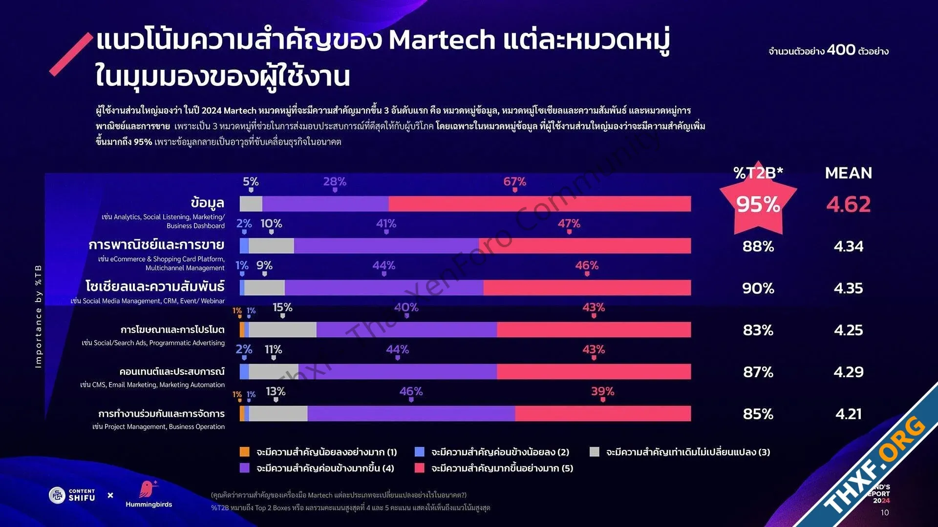 หมวดหมู่ Martech ที่ผู้คนให้ความสำคัญในปี 2024 มากที่สุด คือ หมวดหมู่ข้อมูล, หมวดหมู่โซเชียลและความสัมพันธ์ และ หมวดหมู่การพาณิชย์และการขาย โดยข้อมูลเป็นหมวดหมู่ที่ผู้คนให้ความสำคัญสูงถึง 95%