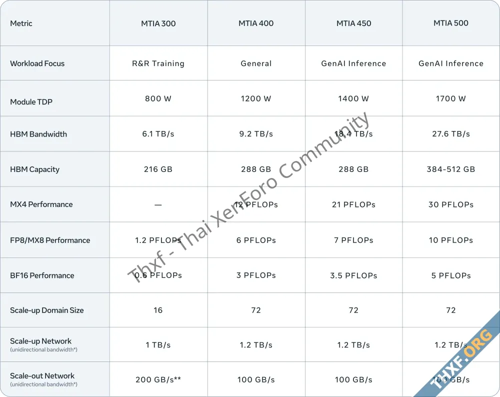 - MTIA 500 เดินหน้าต่อในเส้นทางการรัน GenAI โดยจะเพิ่มแบนด์วิดท์ HBM อีก 50% จากรุ่น 450 และรองรับข้อมูลประเภท low precision เพิ่มเติม มีกำหนดใช้งานจำนวนมากในช่วงปี 2027