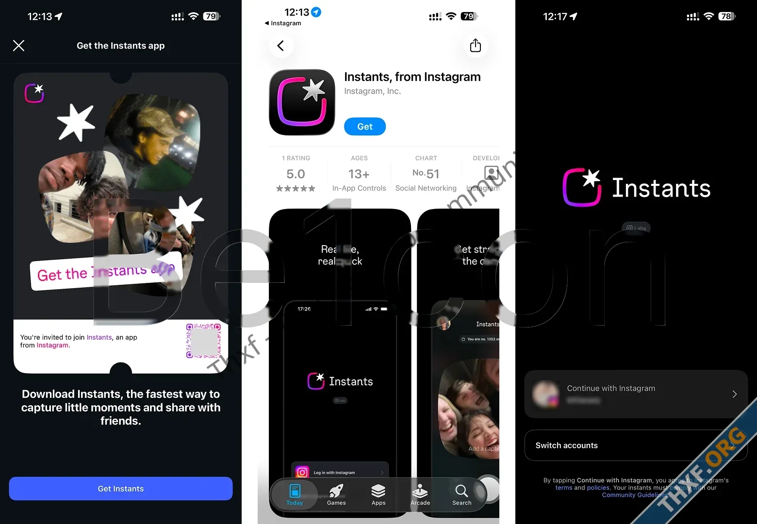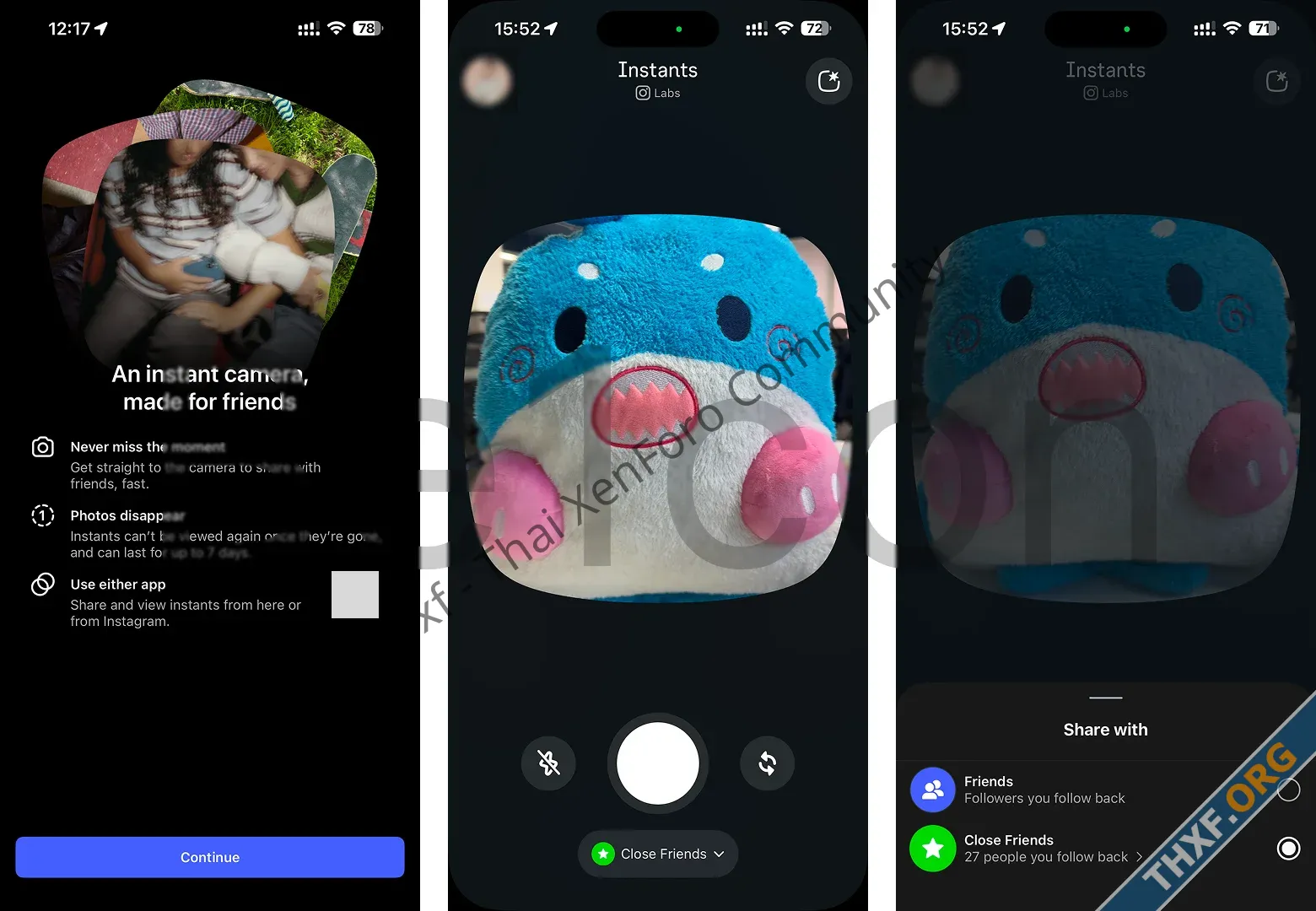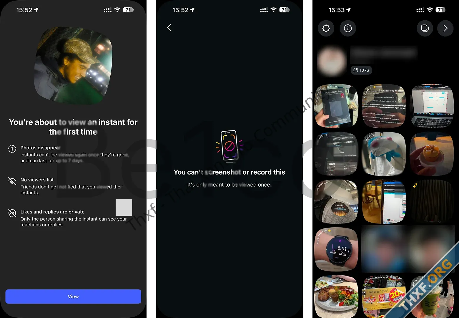 แน่นอนว่า ตัวแอปยังคงอิงจาก Instagram เป็นหลัก และการแชร์เนื้อหาจากแอป Instants จะยังคงมองเห็นได้ทั้ง Instagram และ Instants ครับ แถมคอนเซปต์ยังเหมือนกันกับที่อยู่บน Instagram อีกด้วย ทั้งการป้องกันการแคปหน้าจอ (ภาพตรงกลางด้านล่าง) หรือแม้แต่การใส่ข้อความใน Instants