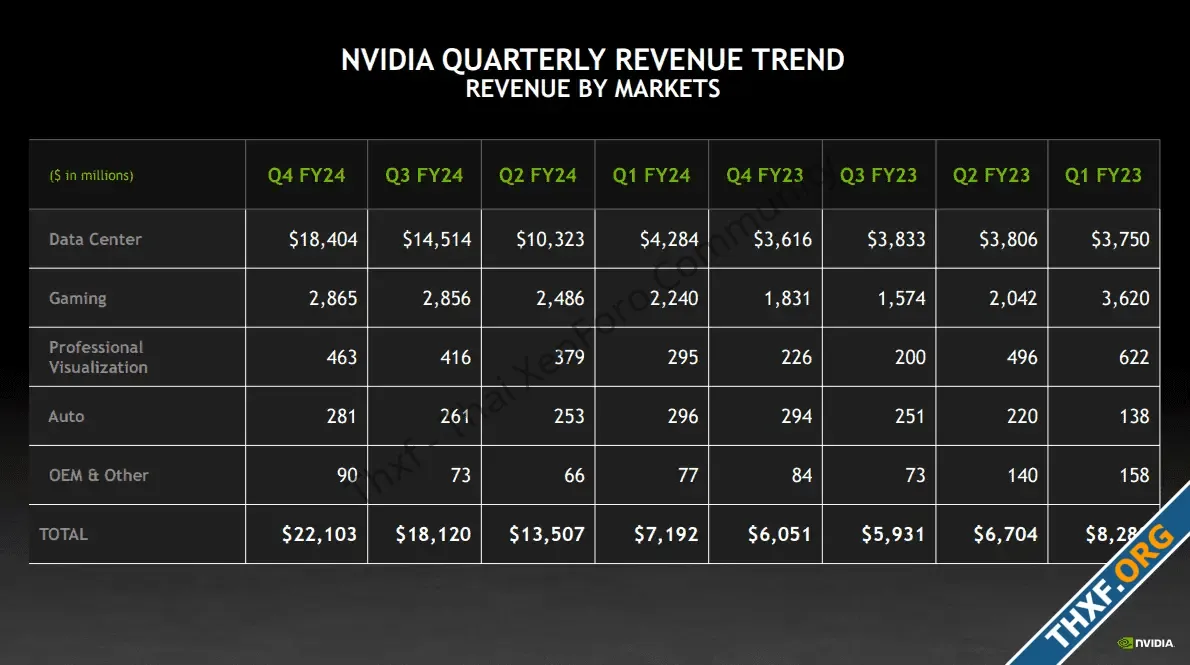 NVIDIA รายงานผลประกอบการประจำไตรมาสที่ 4 ตามปีการเงินบริษัท 2024 สิ้นสุดวันที่ 28 มกราคม รายได้ทำสถิติใหม่สูงสุดของบริษัท 22,103 ล้านดอลลาร์ เพิ่มขึ้น 265% เทียบกับไตรมาสเดียวกันในปีก่อน และเพิ่มขึ้น 27% เมื่อเทียบกับไตรมาสก่อนหน้านี้ โดยมีกำไรสุทธิตามบัญชี GAAP 12,285 ล้านดอลลาร์